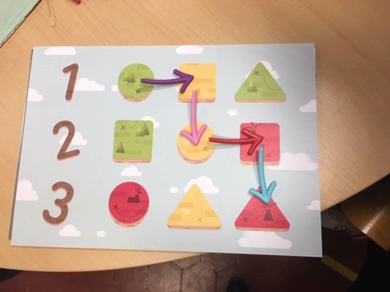 -utiliser les formes et les couleurs si l’utilisation des notions spatiales restent complexes