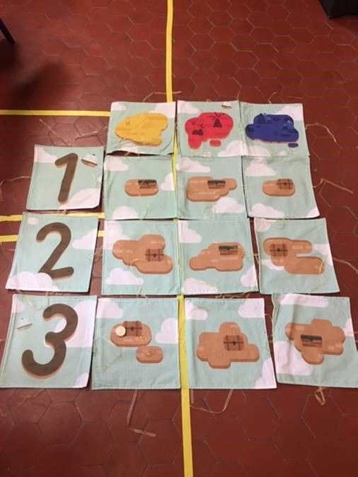 - Ce jeu permet de se repérer dans l’espace et de comprendre comment fonctionne un tableau à double entrée puisque l’enfant peut le créer ou l’utiliser corporellement. Ce jeu allie donc engagement corporel et acquisition des notions spatiales (droite, gauche, devant, derrière …). L’enfant expérimente la notion dans son corps.
