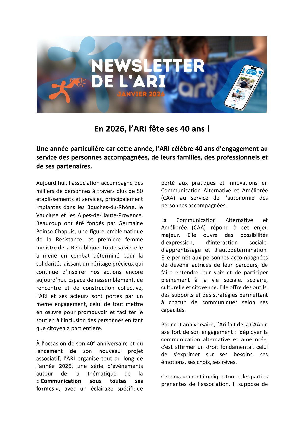 Une année particulière car, cette année, l’ARI célèbre 40 ans d’engagement au service des personnes accompagnées, de leurs familles, des professionnels et de ses partenaires. 🎂