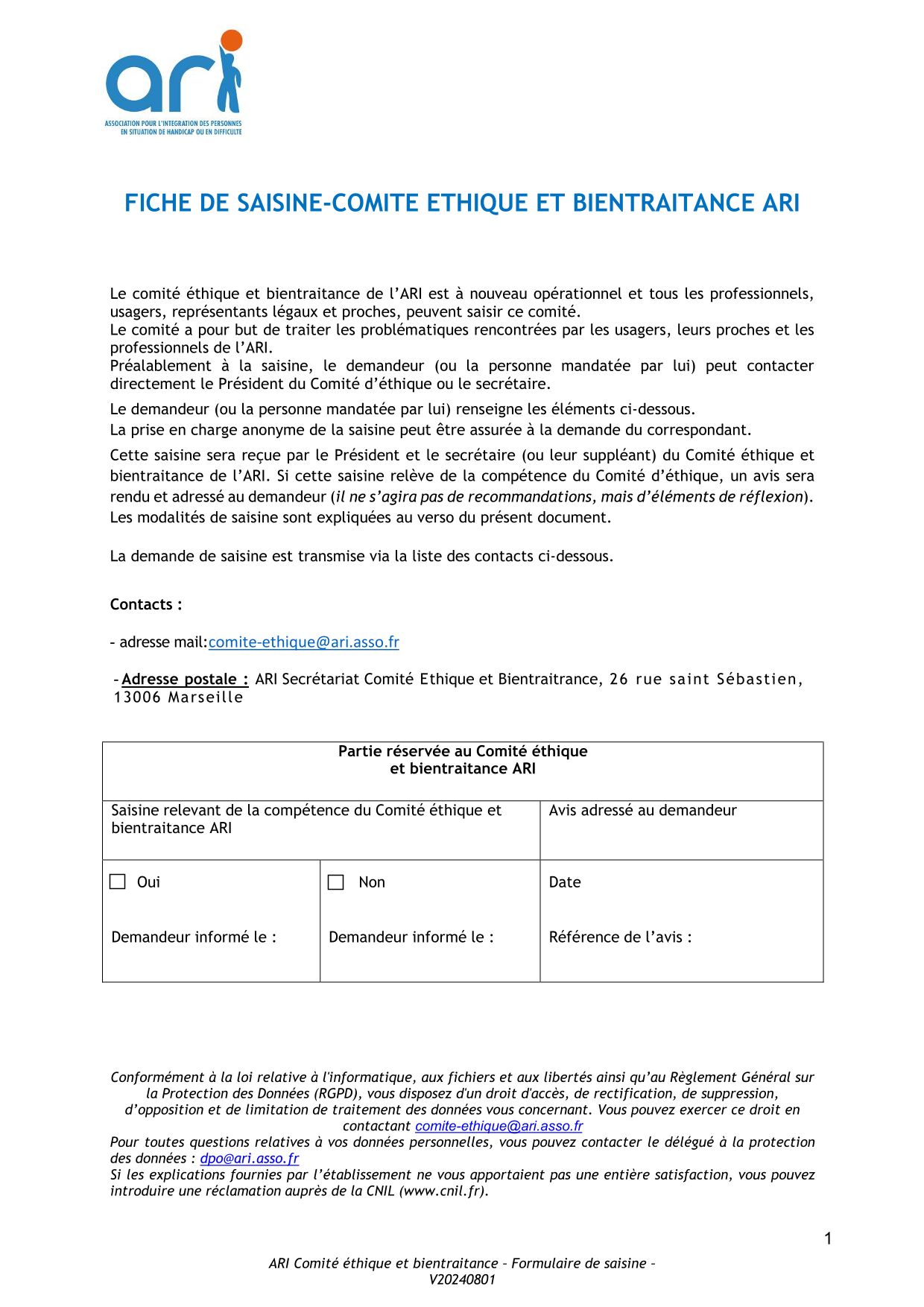 Un Comité éthique et bientraitance pour traiter de questions ou sujets éthiques soulevés par les usagers, leurs proches ou les professionnels de l'Ari.